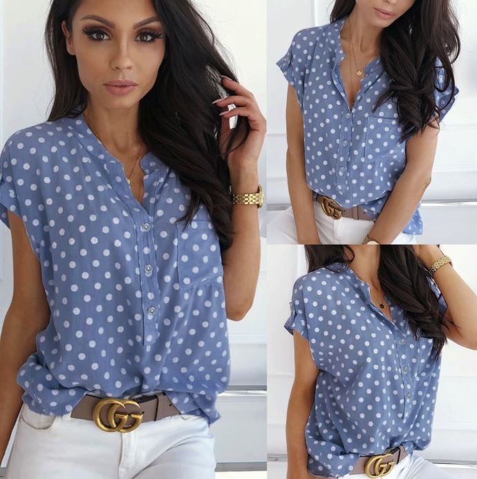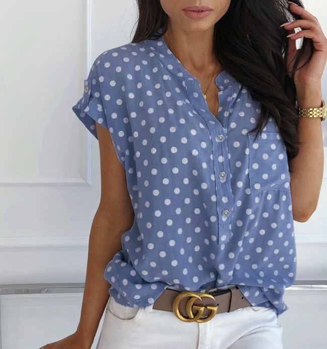 Light blue polka dot women's shirt with short sleeves