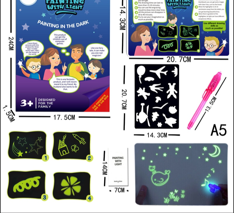 • Package contents: drawing board, drawing template, light pen, 3x LR41 batteries, 1.5V