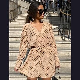 Light summer dress, made of polyester and chiffon. Beautiful polka dot pattern, very airy and pleasant.