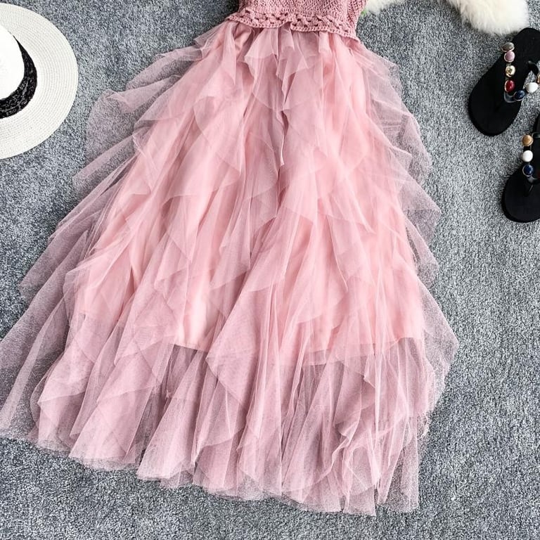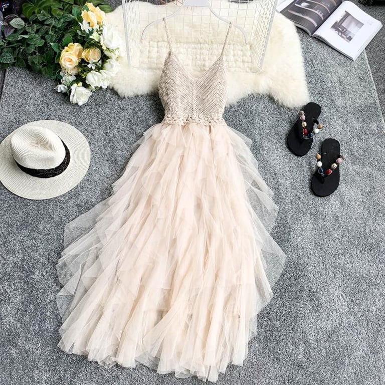 Beautiful dress with a crocheted corset and a long layered tulle skirt.