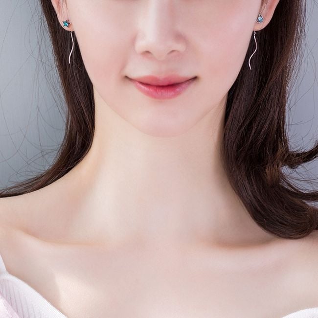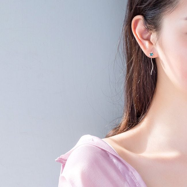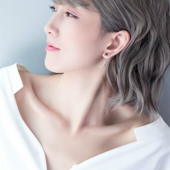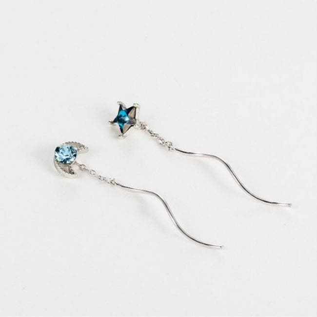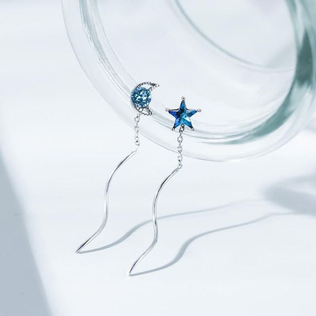 The earrings are drop earrings, one is adorned with a star at the top and the other is decorated with a moon complemented by a blue gemstone. The earrings are very elegant and suitable as an accessory for everyday wear as well as social events.