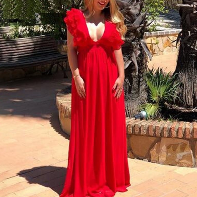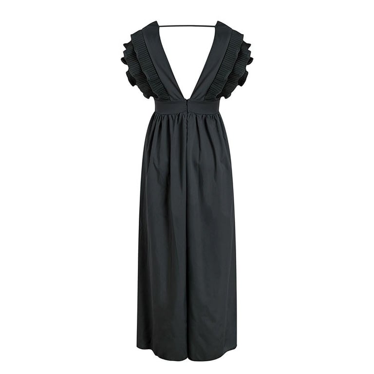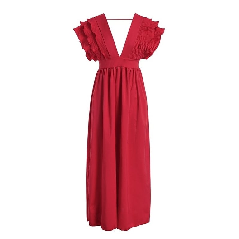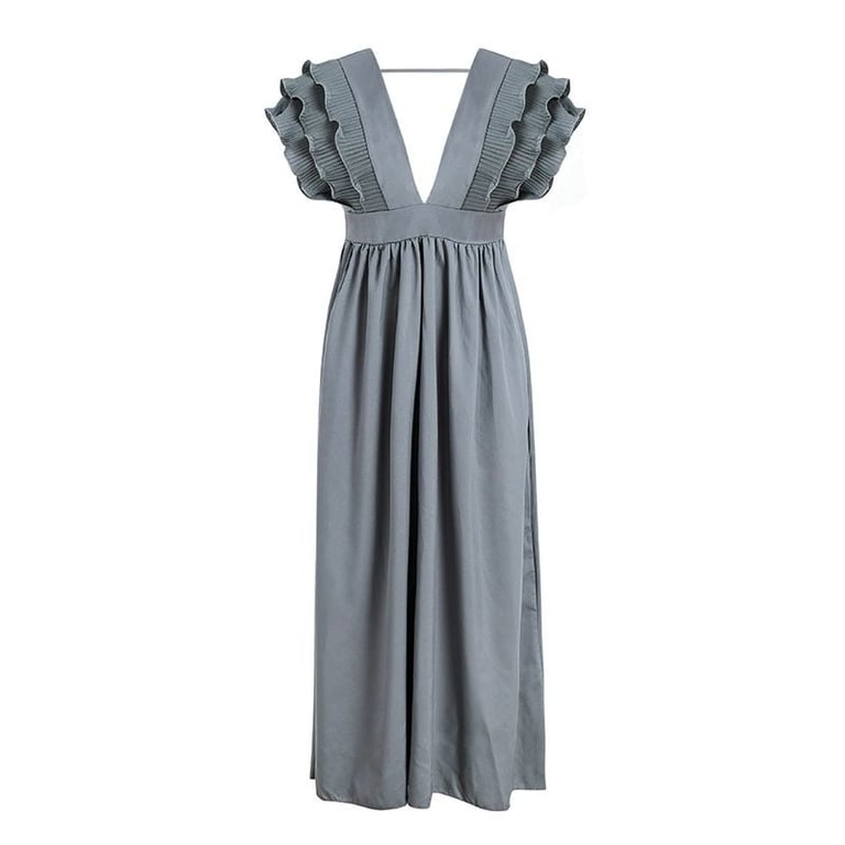 Women's long sleeveless dress adorned with ruffles. Deep neckline and comfortable material.