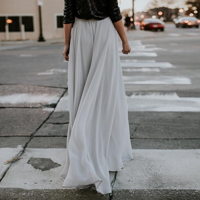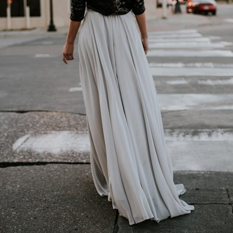 Long grey elegant women's skirt with gathering.