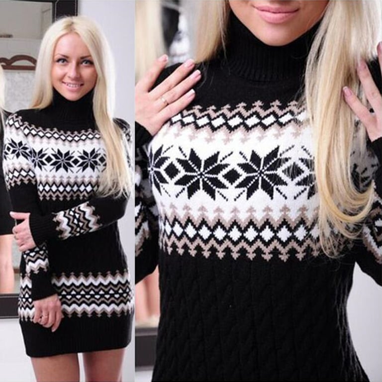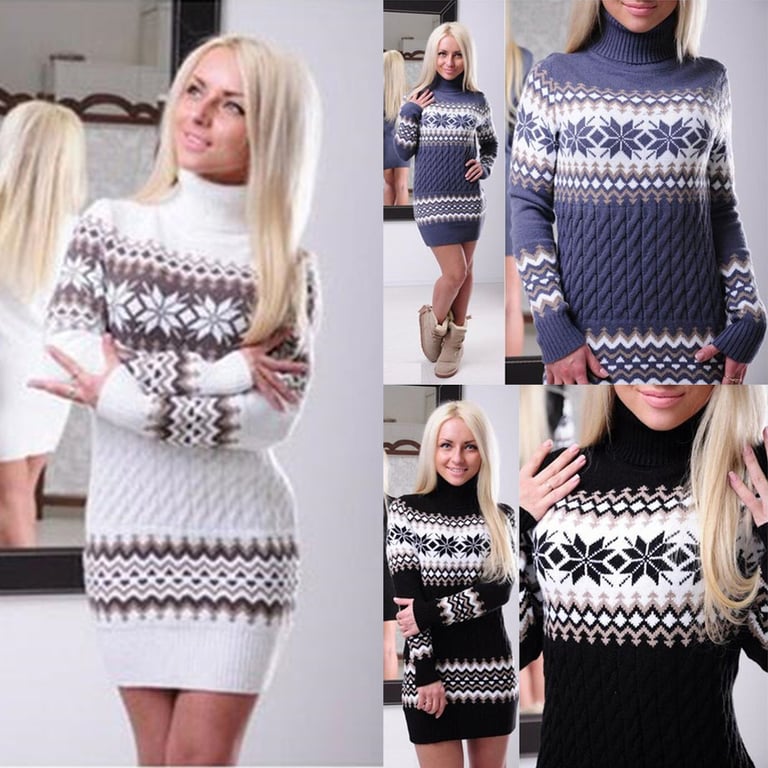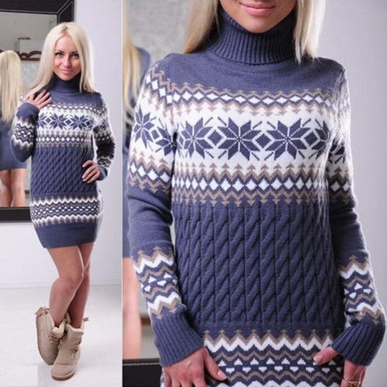 Beautiful long sweater with a Norwegian pattern. It is knitted, has a roll neck, and is perfect for the cold season.