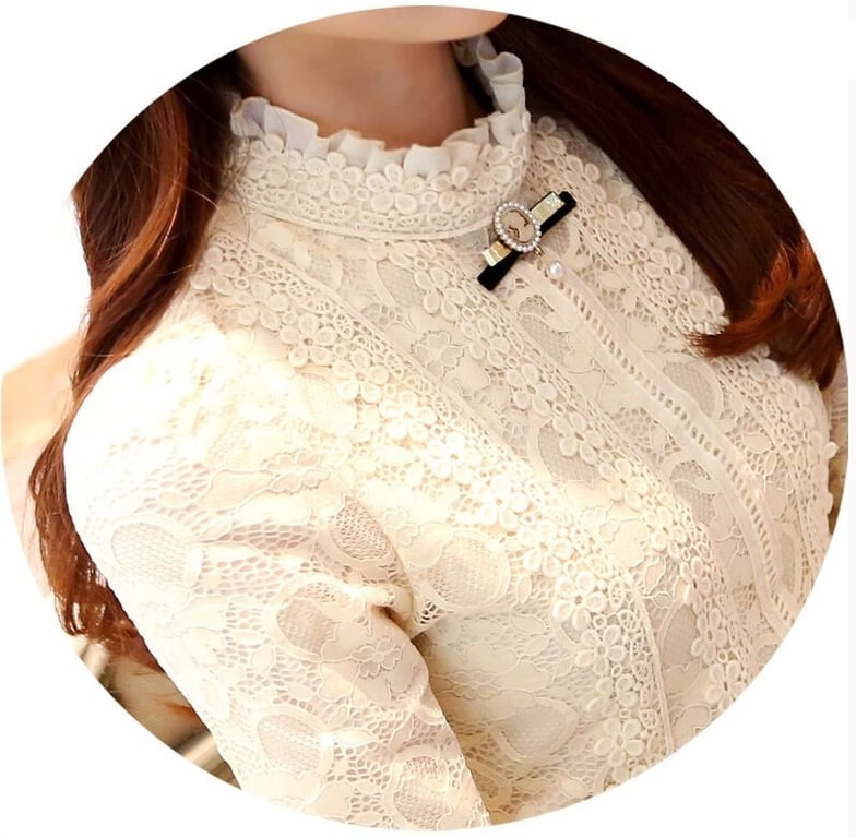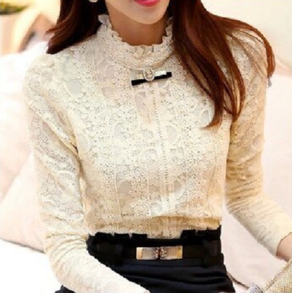 The blouse features a shorter turtleneck adorned with a metal decoration.