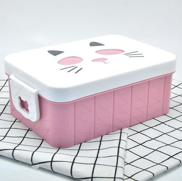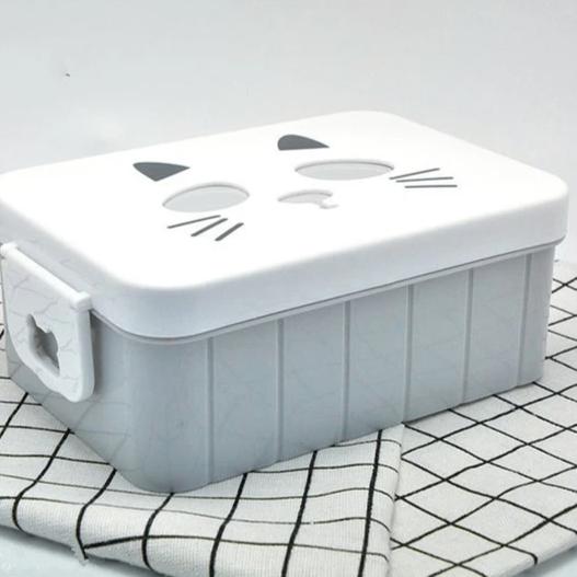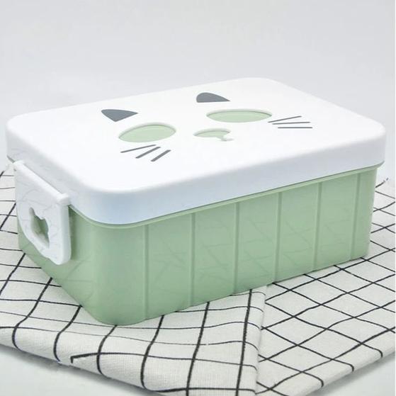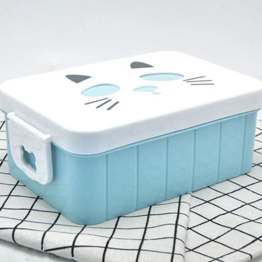 Cute and spacious lunchbox with a spoon! The box has two compartments for different types of snacks.
