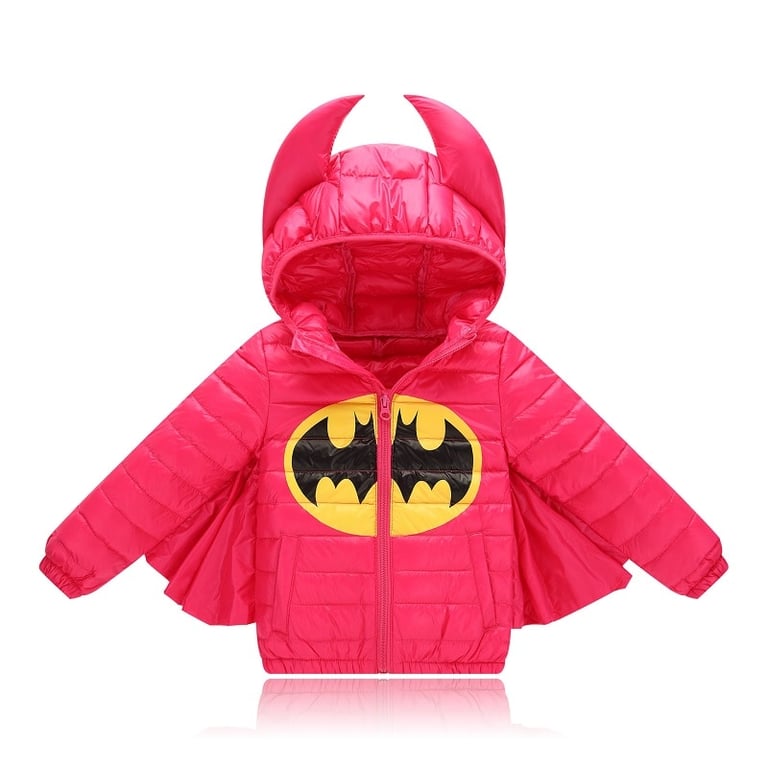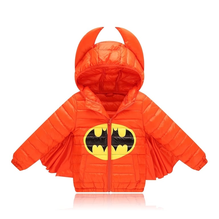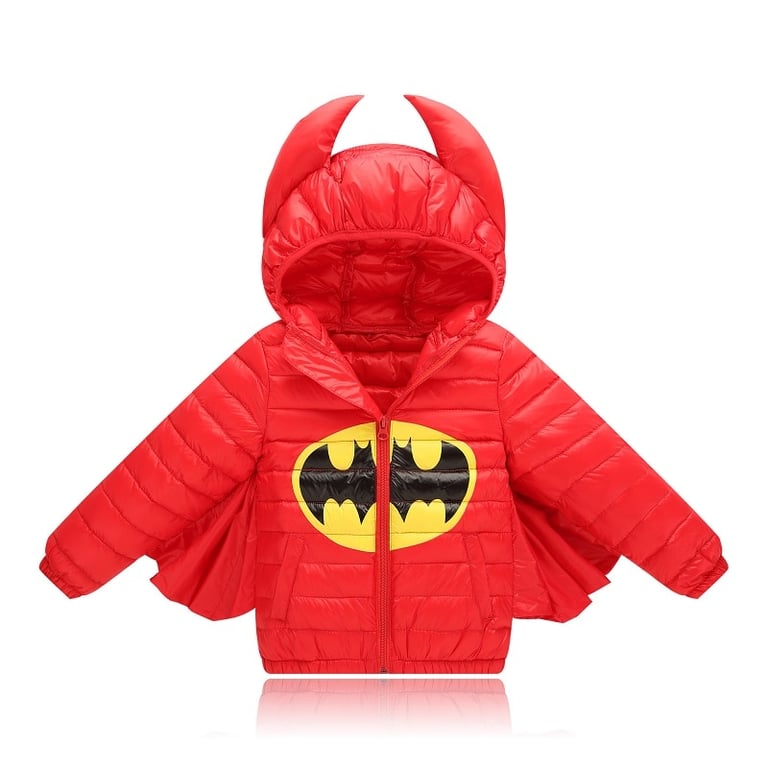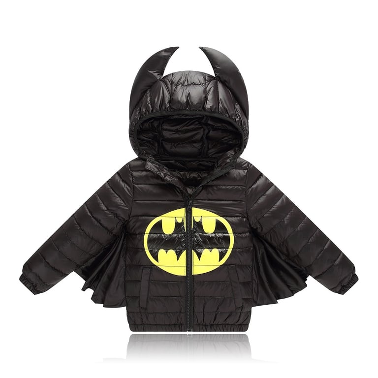 Warm winter jacket for children featuring a Batman motif. Jacket with a hood, zip fastening and two side pockets.