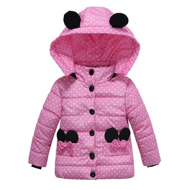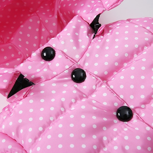 Very fashionable winter jacket with polka dots and bows will not only charm your little girl but will also keep her warm.