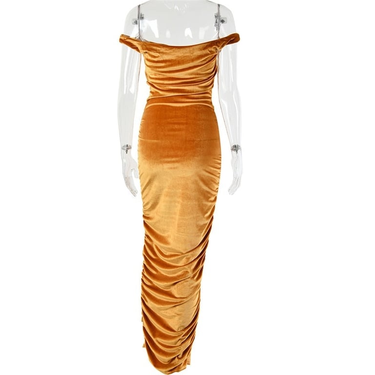 Luxury long velvet dress with off-the-shoulder design highlighting the neckline.