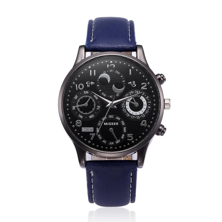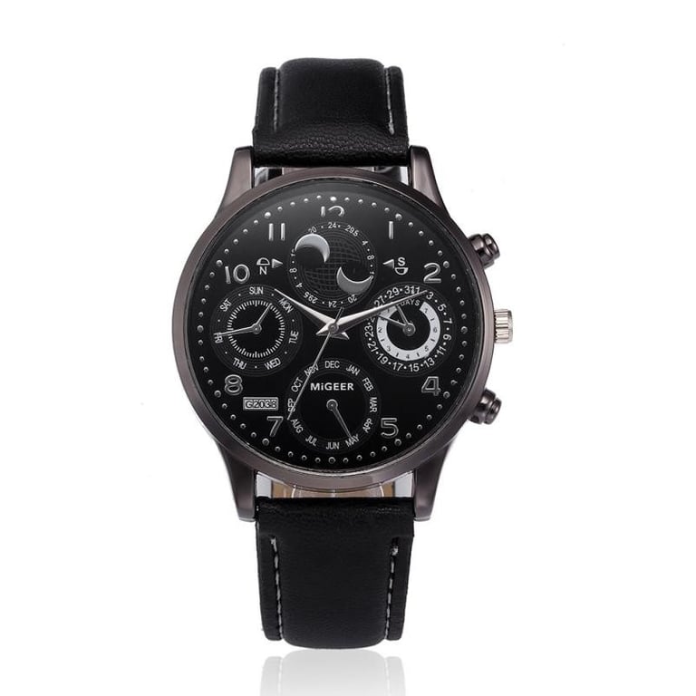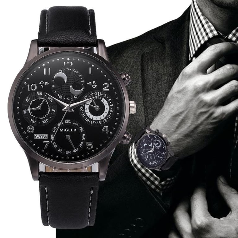 Men's watch in a luxurious design with a leather-look strap and a numeric dial with a metal frame.