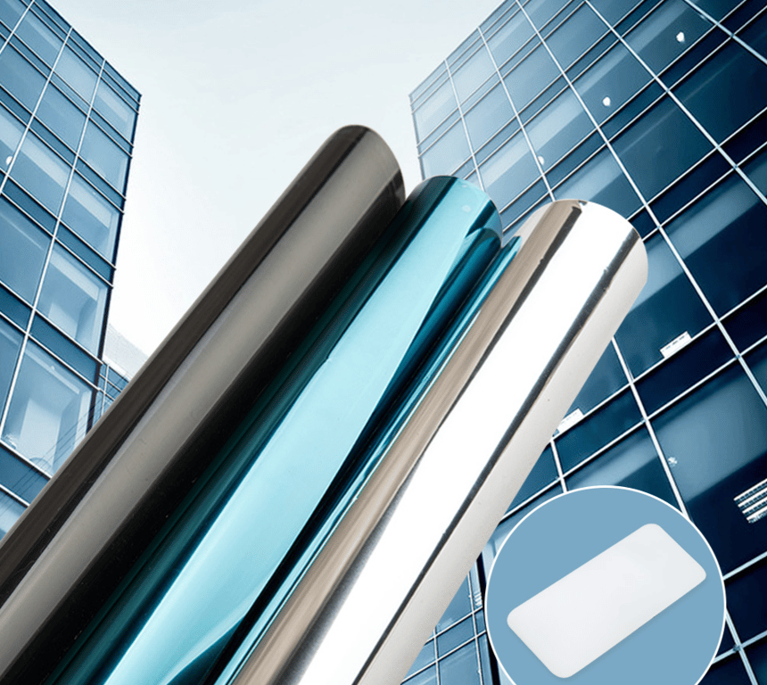 One-way mirrored film for windows and doors. Available in blue and silver.