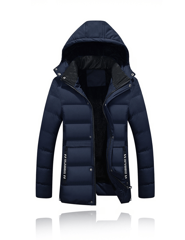 An attractive men's parka jacket features a practical hood that can be removed as needed. The jacket has a double fastening. The inner fastening is a classic zip, while the outer fastening is through buttons. The jacket will keep you warm during the colder months thanks to its high fastening. The lining is located inside the jacket. The jacket includes external pockets.
