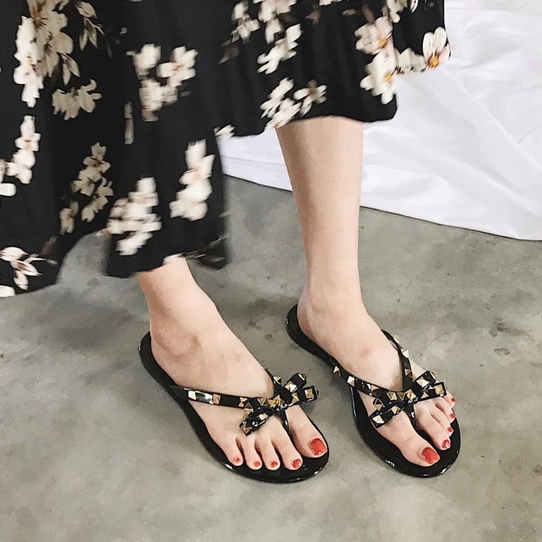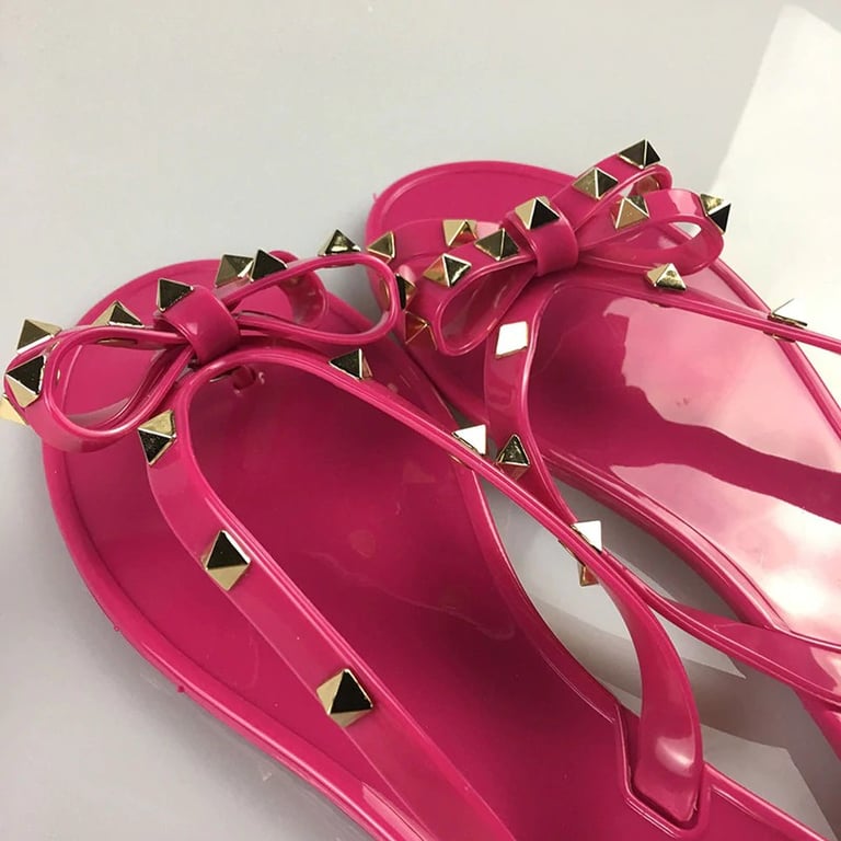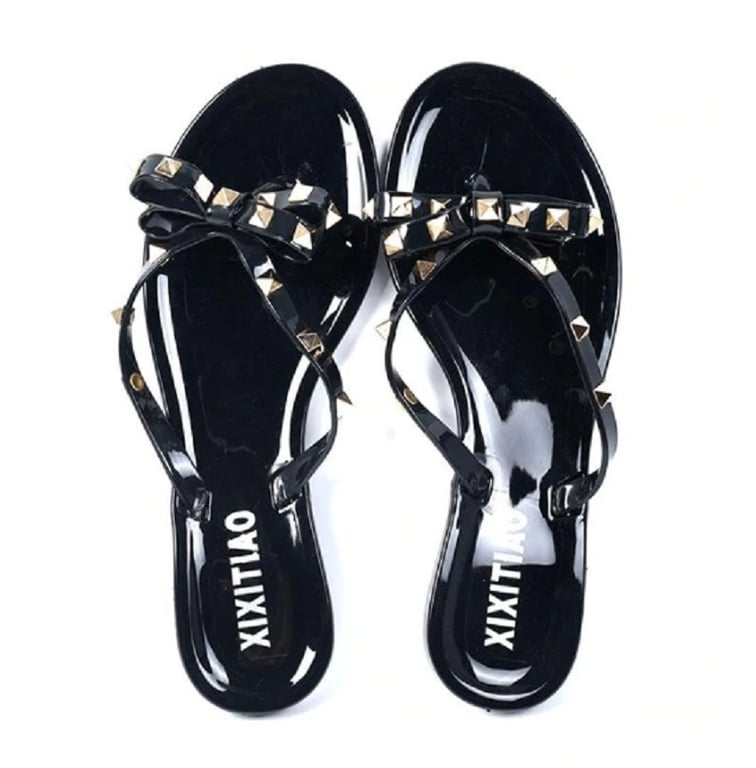 The flip-flops are adorned with a bow and studs.