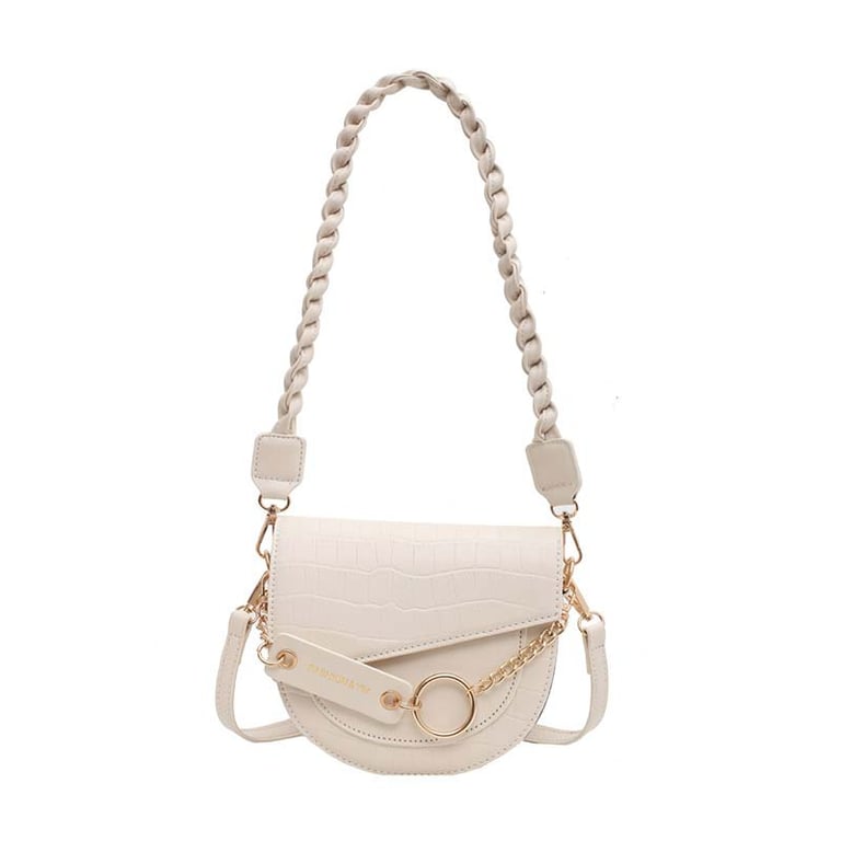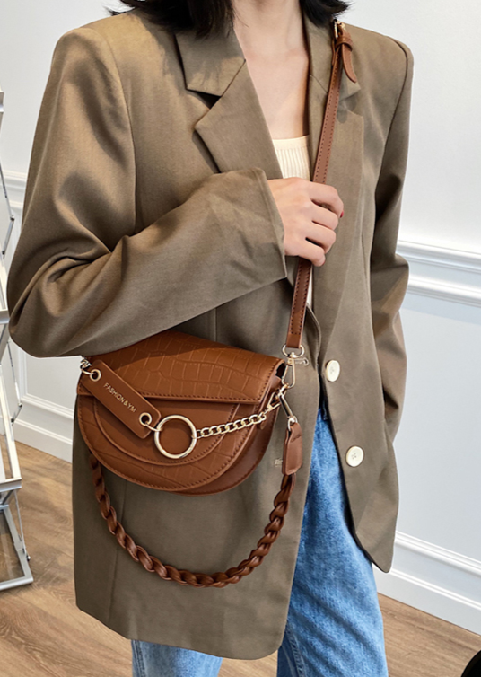 Elegant half-moon shape of the bag, adorned with a chain and two design-distinct shoulder straps.