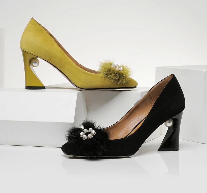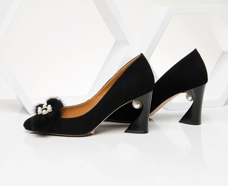 You will love these elegant pumps with a fluffy decoration at the toe.