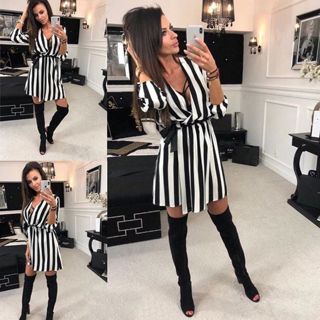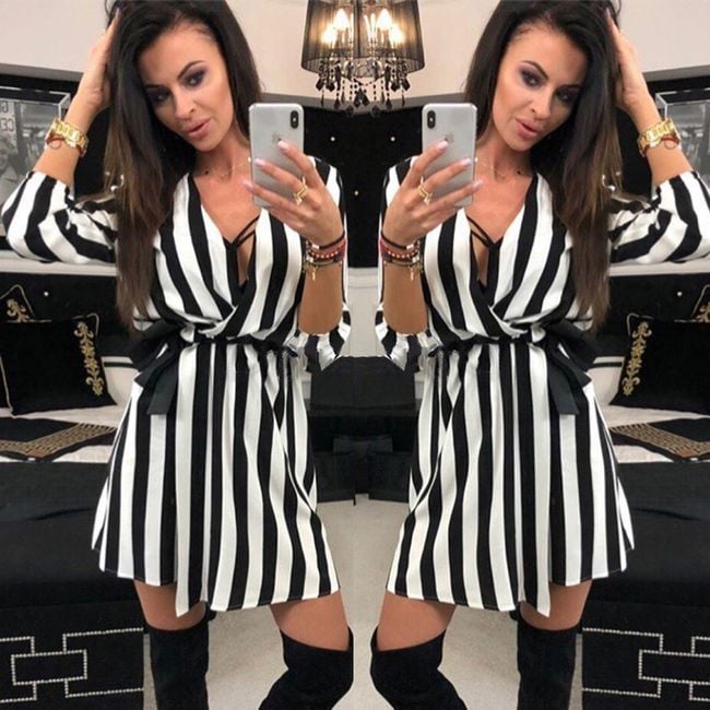 Elegant women's loose-fitting dress features three-quarter sleeves and a deep neckline. The entire design of the dress is in a striped black and white pattern.