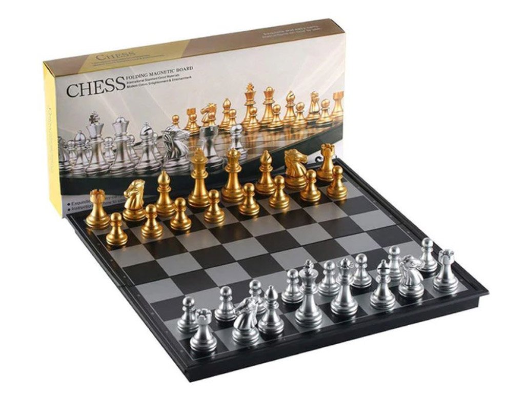 High-quality magnetic chess in gold-silver design with a box chessboard. The chessboard is magnetic, the pieces hold well, and to reduce noise, they have a soft fabric layer.