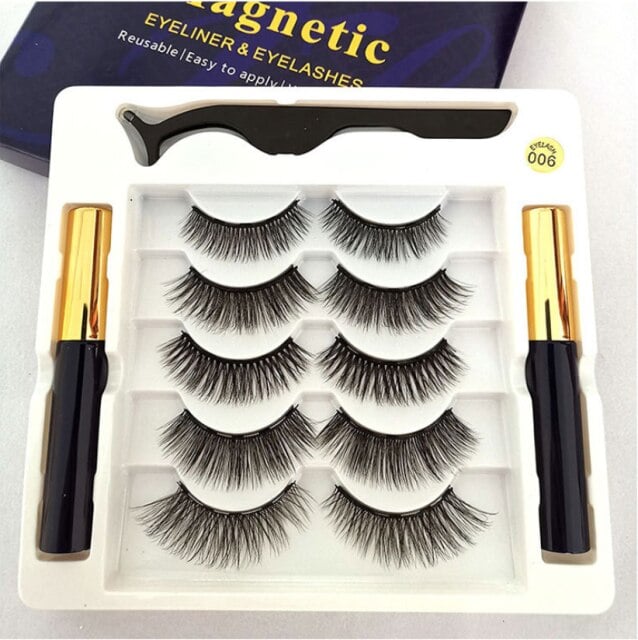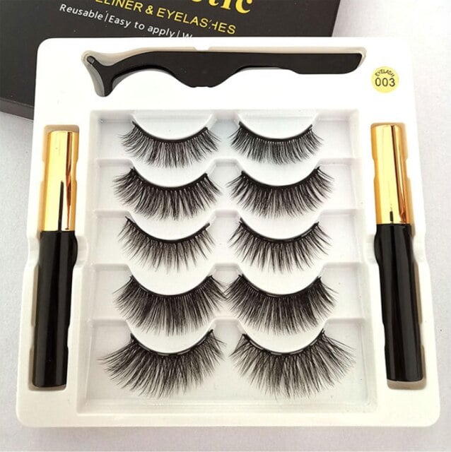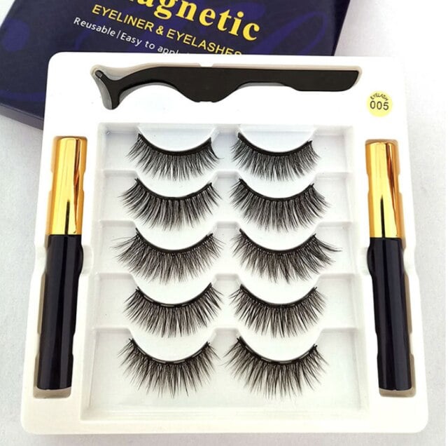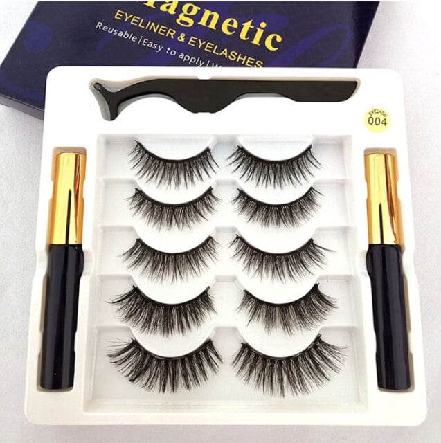 The set includes 5 pairs, an eyelash tweezer, and glue.