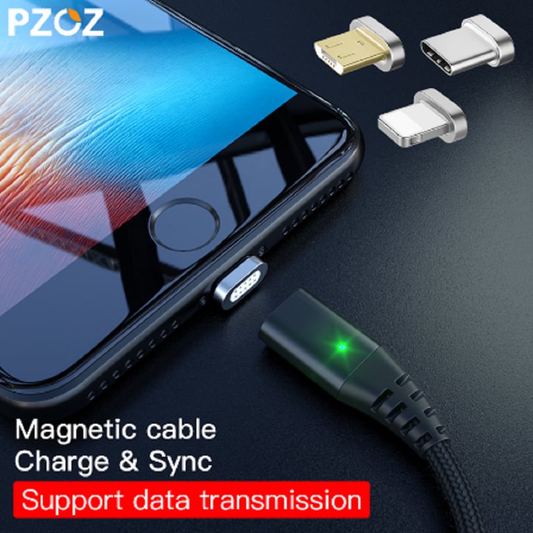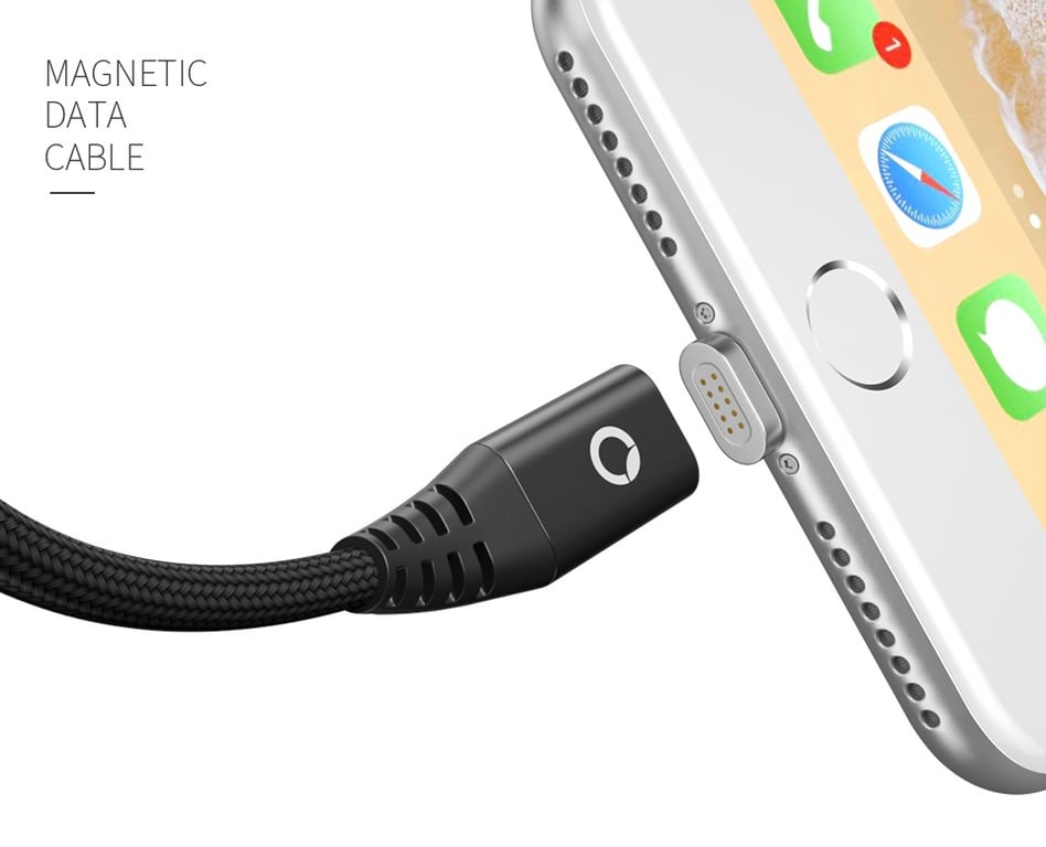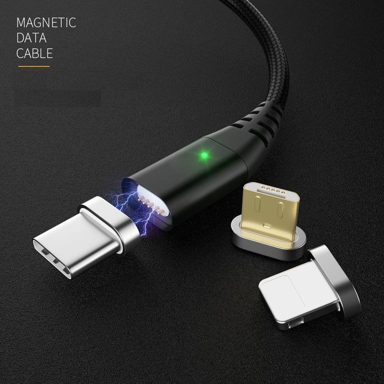 USB data and charging cable for Apple, type C and micro USB with a metal magnet.