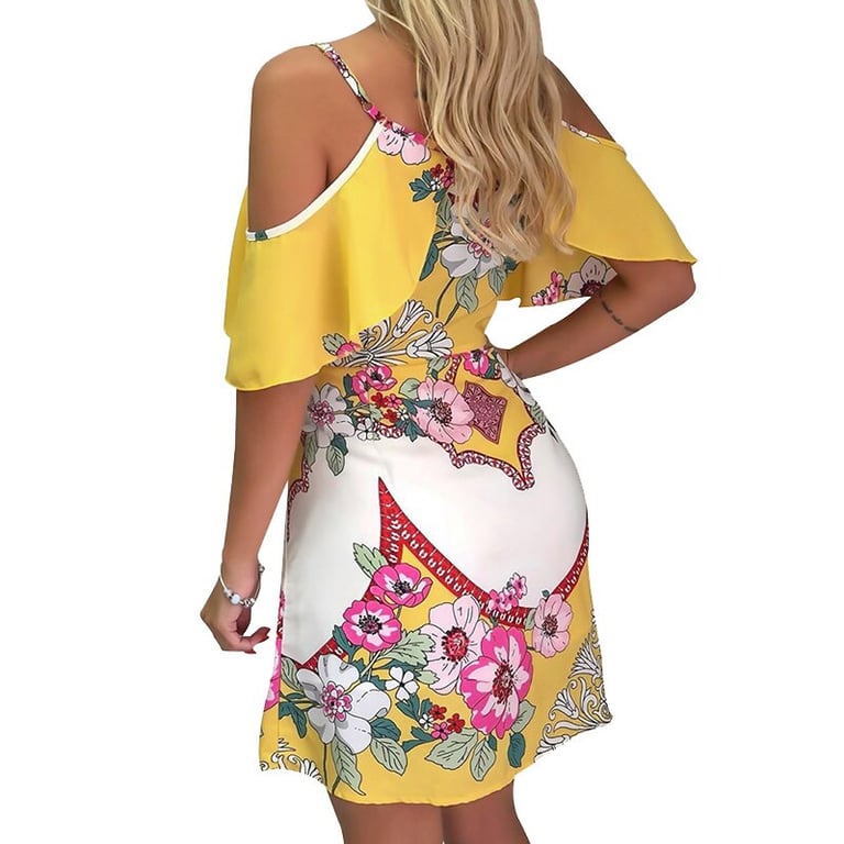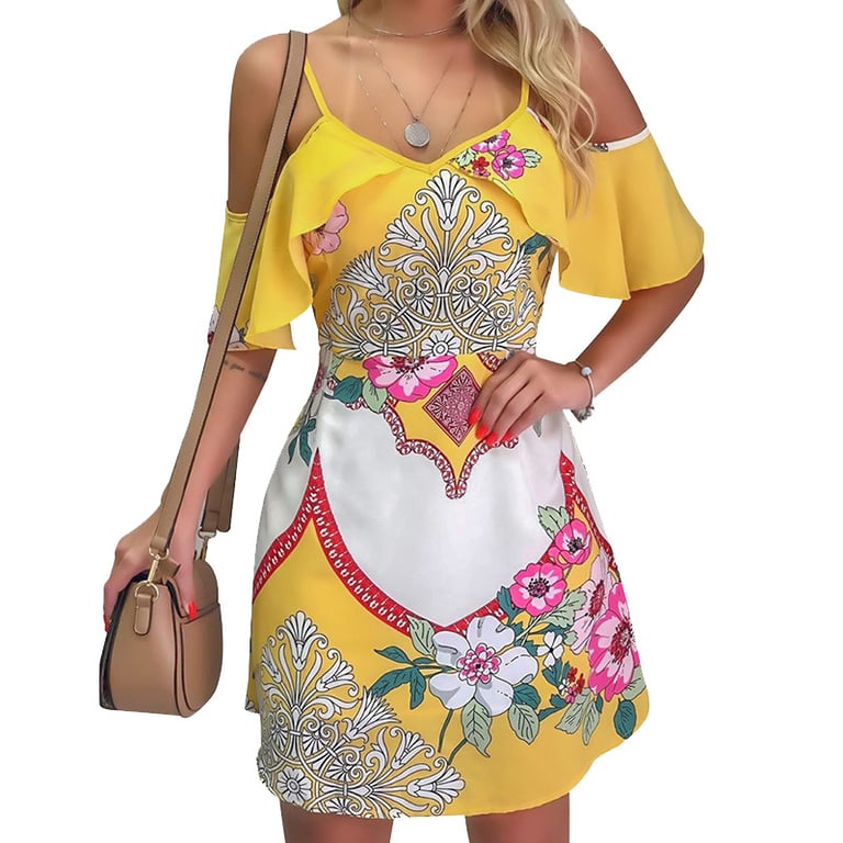 Women's short dress fitted at the waist. Loose skirt above the knee. Short sleeves with ruffles and a neckline with narrow straps. Colourful floral print. Available in multiple variants.