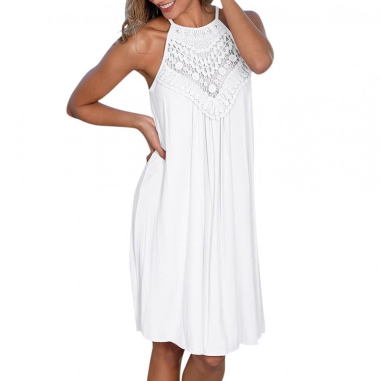 Women's short dress with a halter neckline. Loose fit. Lace detailing. Available in multiple colour options.
