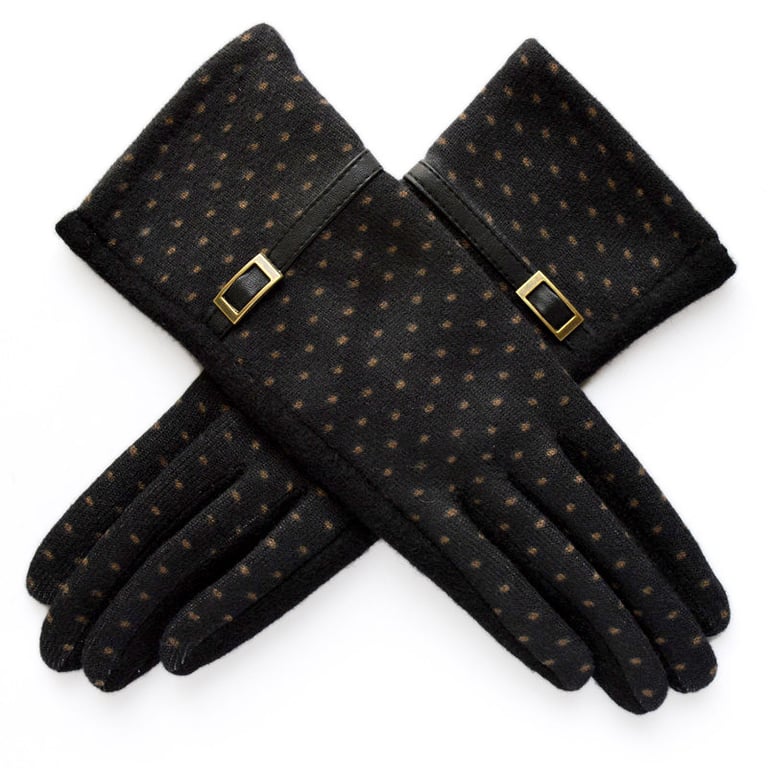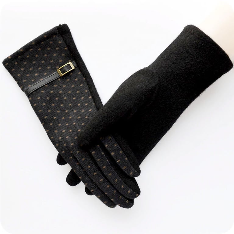 Women's winter gloves with a polka dot pattern and a thin strap around the wrist. Available in various colour options.