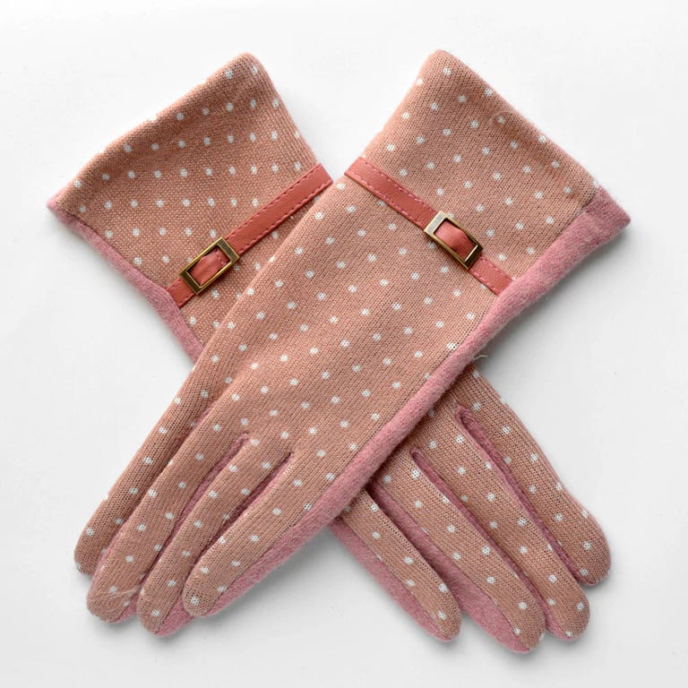 Women's winter gloves with a polka dot pattern and a thin strap around the wrist. Available in various colour options.