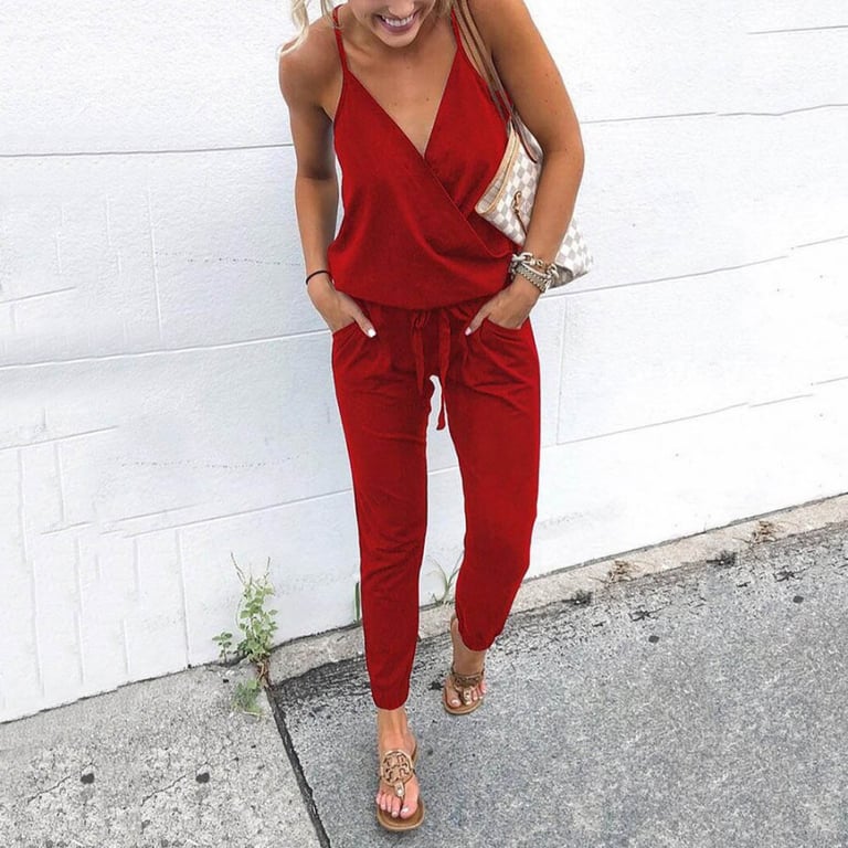 Women's strappy jumpsuit. Loose fit with long legs and an elastic waistband. V-neckline. Available in multiple colour options.