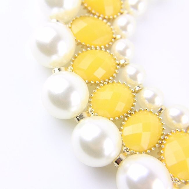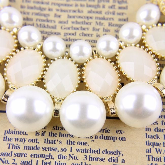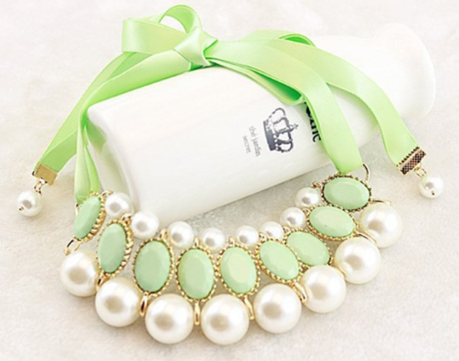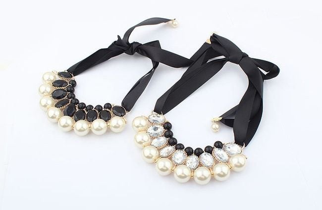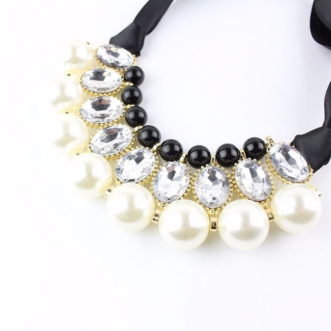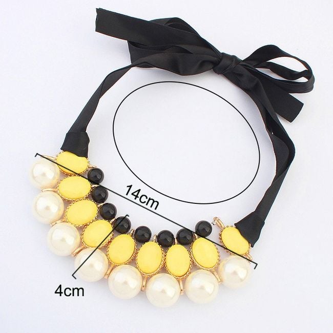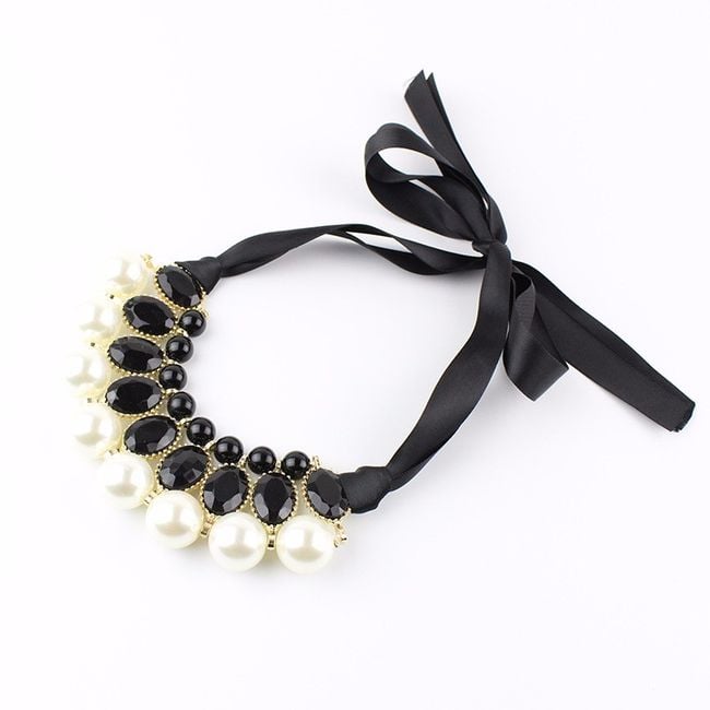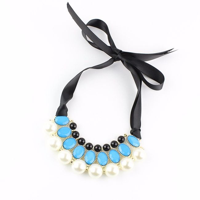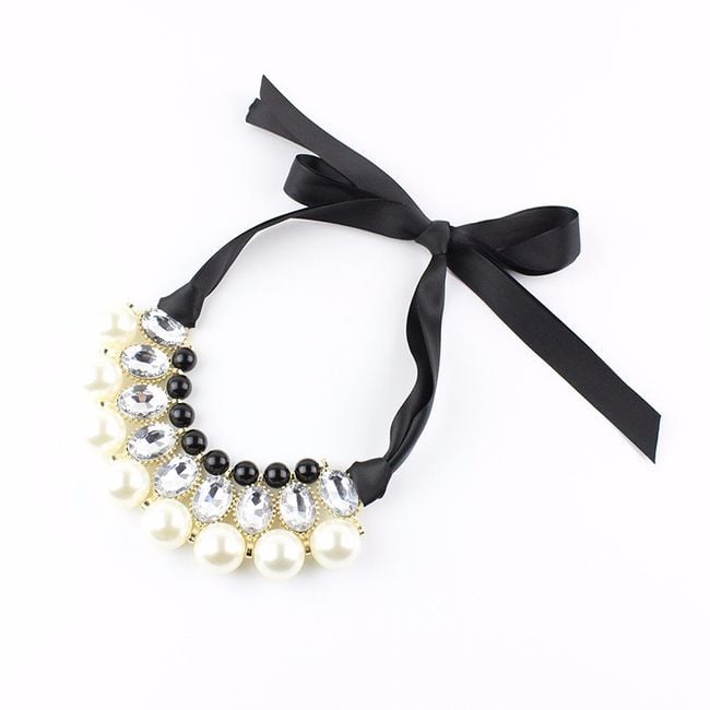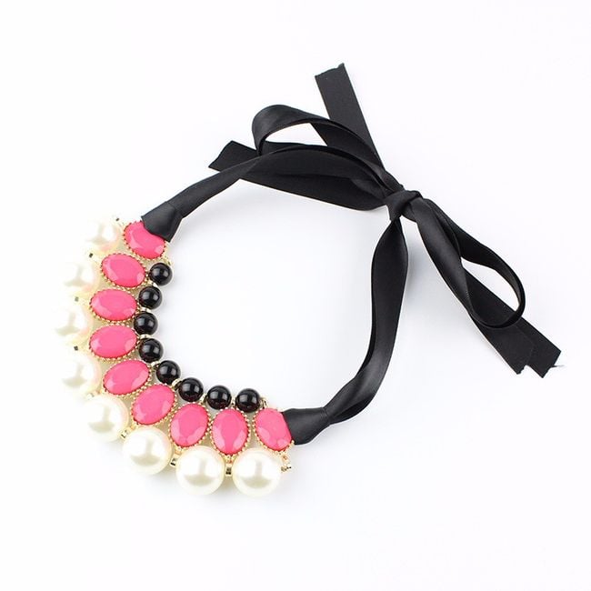 Revitalise your everyday look with this striking chunky necklace. The jewellery features a pendant with stones and pearls. You will surely be captivated by the unconventional fastening in the form of a ribbon, which you tie into a classic bow. The necklace will therefore look effective from the back as well.