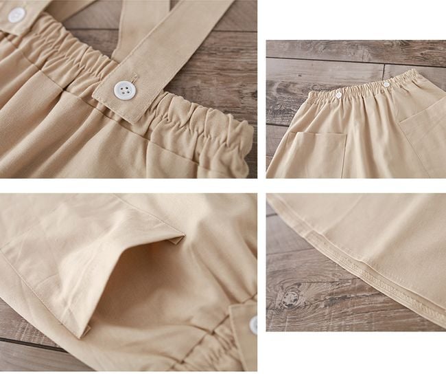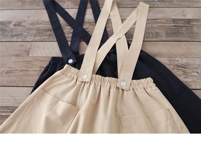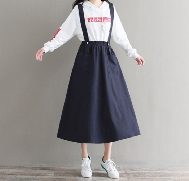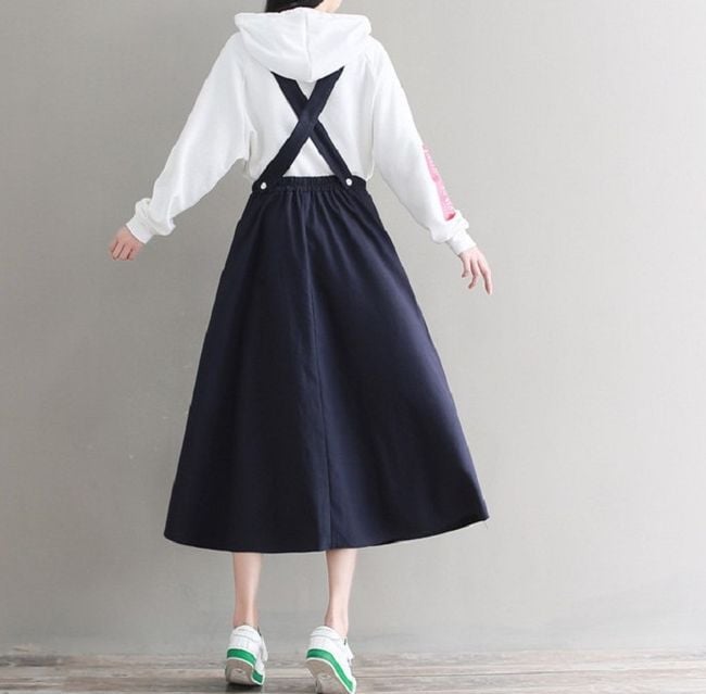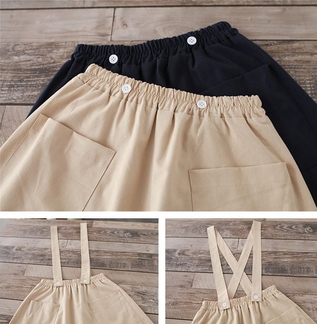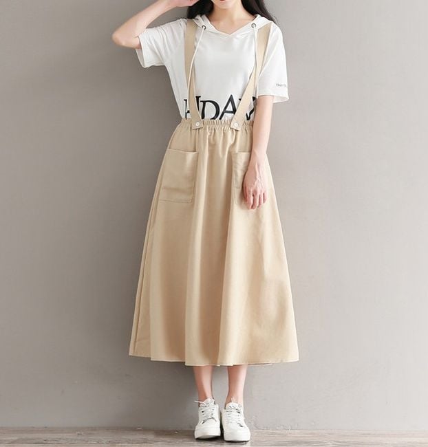 Original maxi skirt with large pockets is equipped with suspenders that fasten with small buttons.
