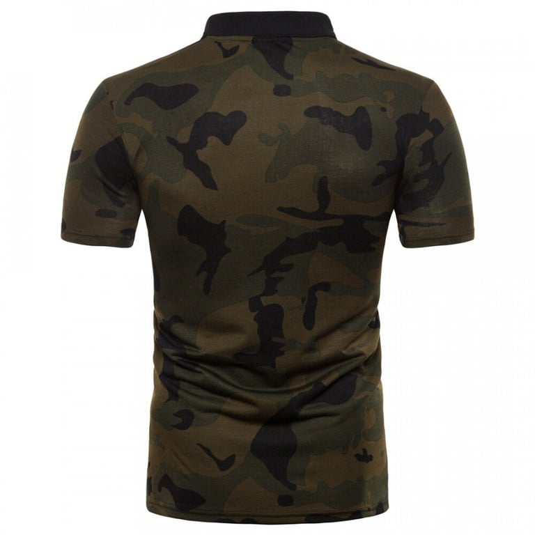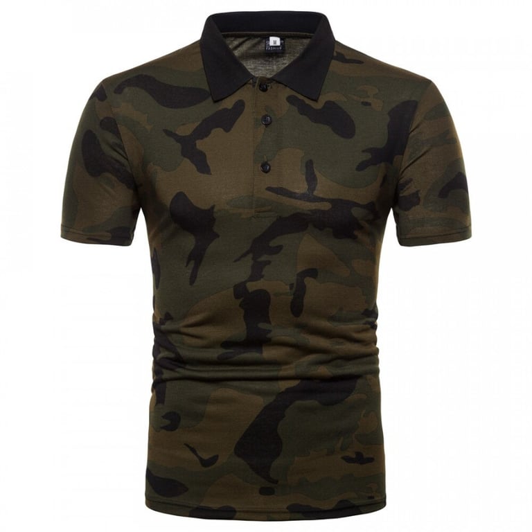 Men's t-shirt with army print. Fitted cut with short sleeves. Collar neckline. Available in two colour options.