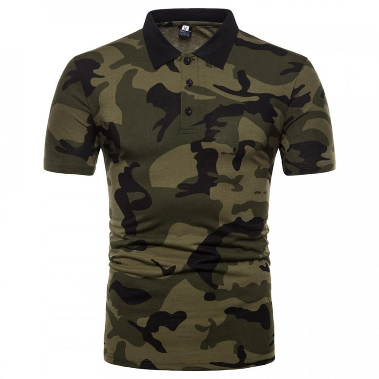 Men's t-shirt with army print. Fitted cut with short sleeves. Collar neckline. Available in two colour options.