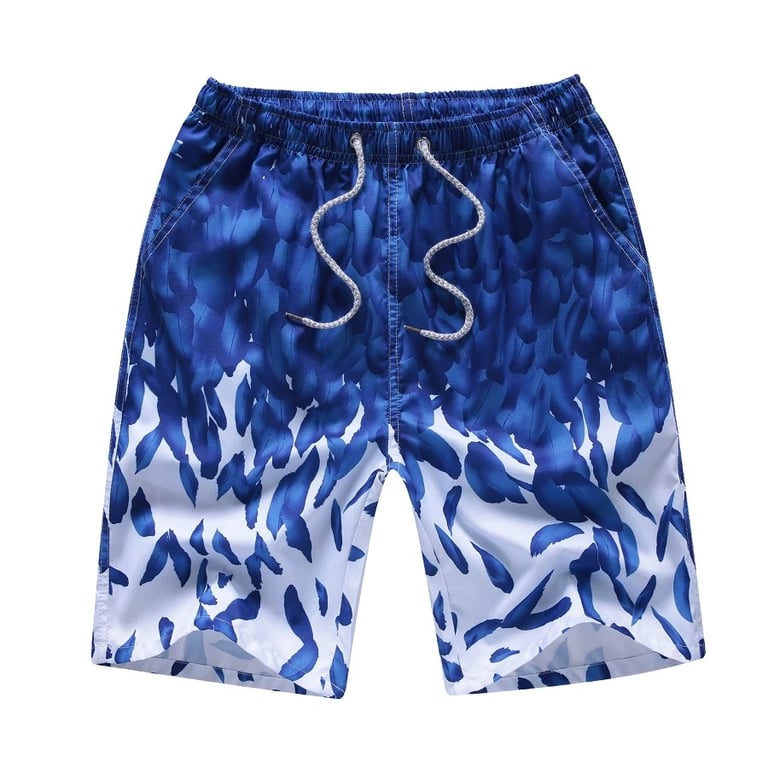 These shorts with a blue bird feather print are the perfect choice for the beach.
