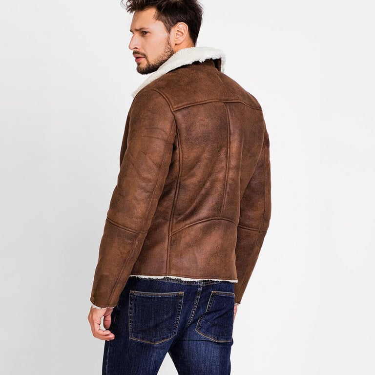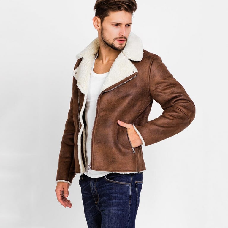 Men's biker-style jacket with shearling. The jacket features a wide collar and an angled zip fastening. Side pockets. Leather look.