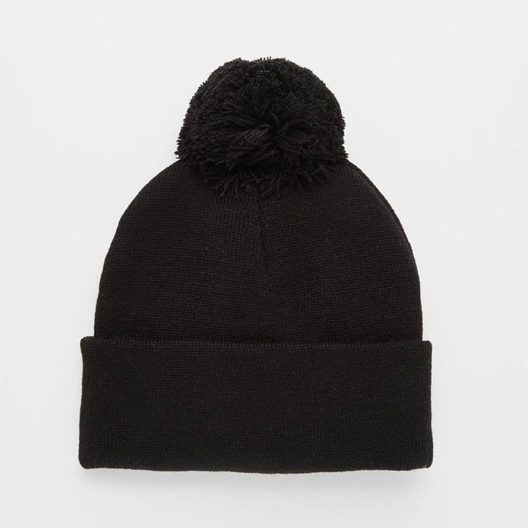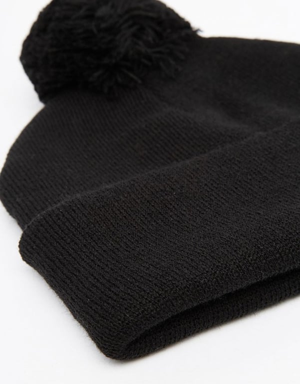 A classic black beanie adorned with a black pom-pom.