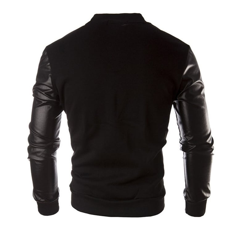 Men's bomber jacket with faux leather sleeves. The jacket is hoodless with a collar and fastens with snaps. Two side pockets. Elastic waistband. Available in multiple colour options.