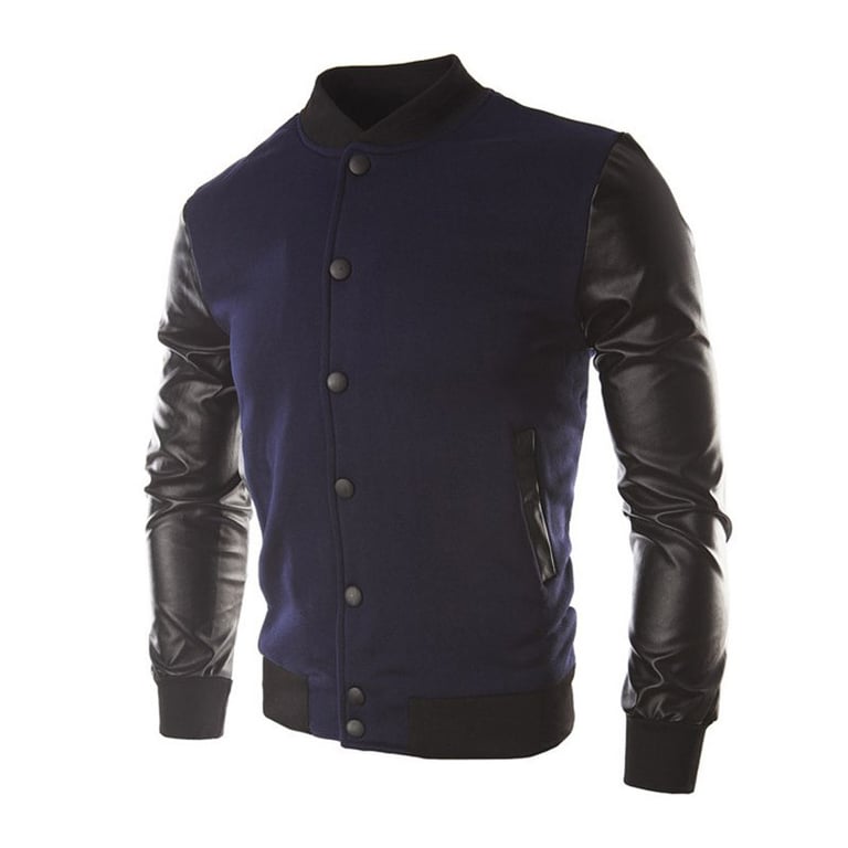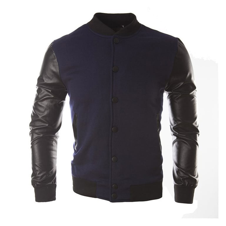 Men's bomber jacket with faux leather sleeves. The jacket is hoodless with a collar and fastens with snaps. Two side pockets. Elastic waistband. Available in multiple colour options.