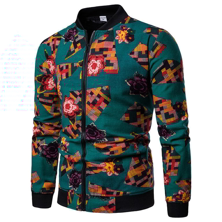 Men's bomber-style sweatshirt. Zip fastening and low collar. Elasticated waistband. Printed with a colourful pattern. Available in multiple variants.