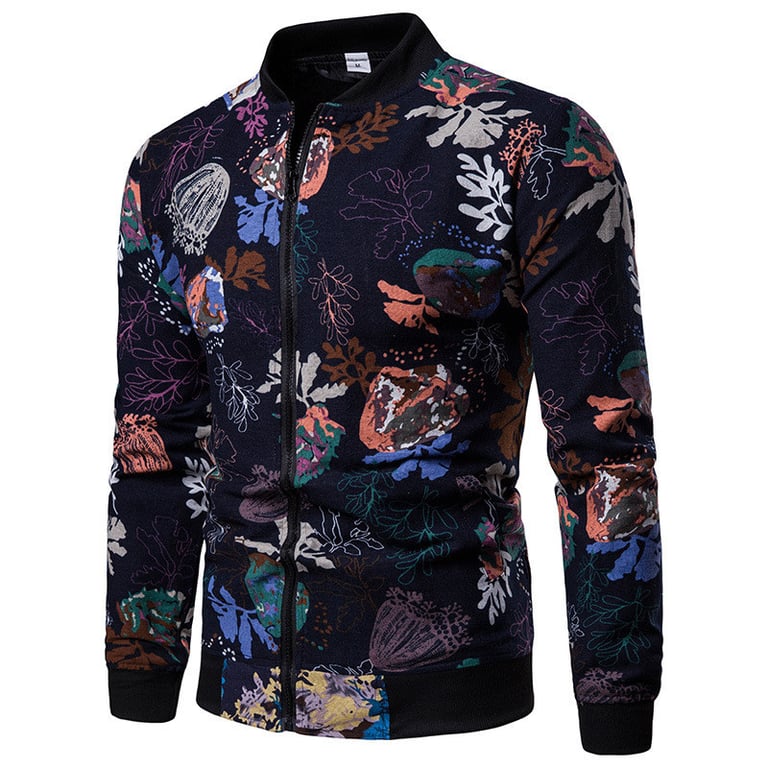 Men's bomber-style sweatshirt. Zip fastening and low collar. Elasticated waistband. Print with a colourful pattern. Available in multiple variants.