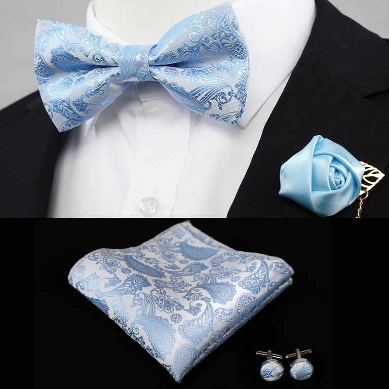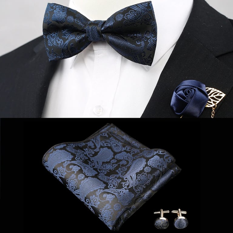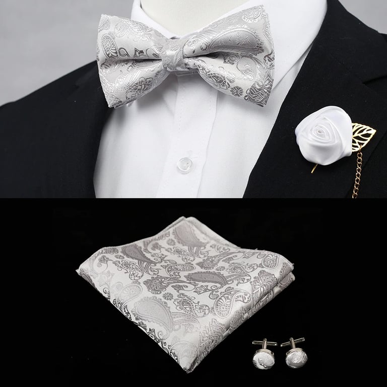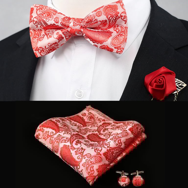 Package contents: 1x bow tie, 1x pocket square, 2x cufflinks, 1x artificial rose