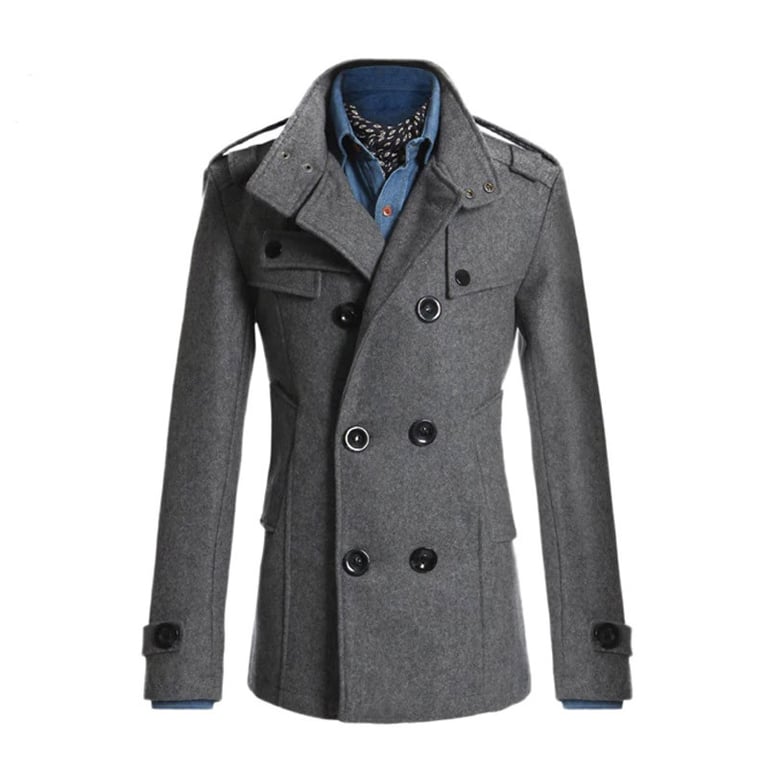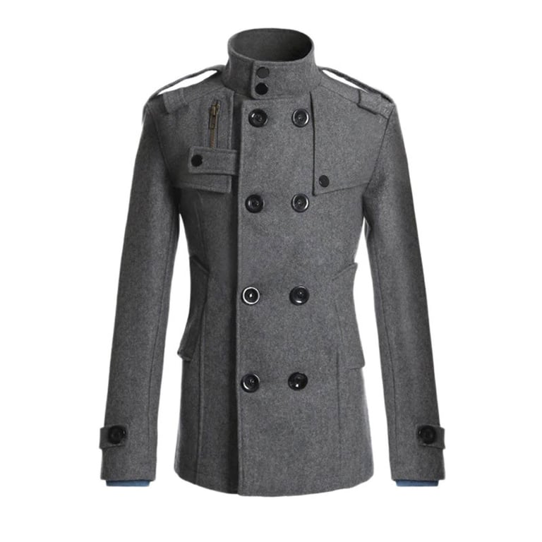 Men's short coat with a high collar. Fitted at the waist. Double-breasted button fastening. Available in multiple colour options.