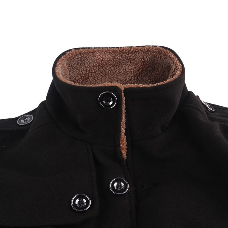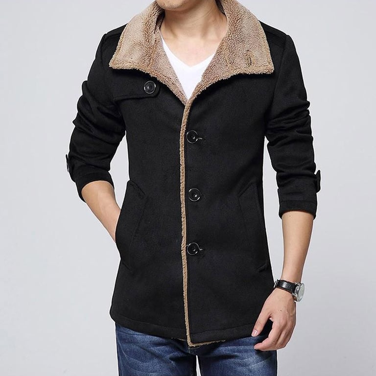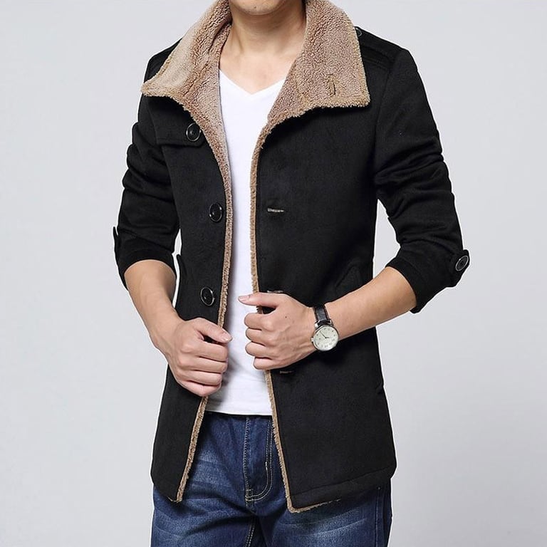 Men's lightweight coat with a high collar. Longer straight cut with button fastening. Two side pockets. Fur lining inside. Available in several colours.