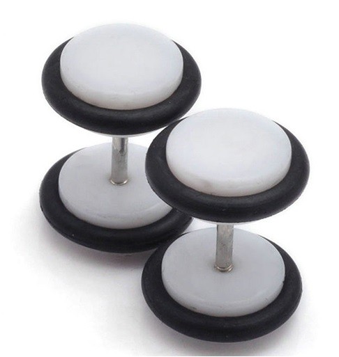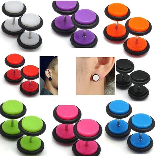 Men's colourful earrings in the shape of a dumbbell.