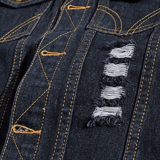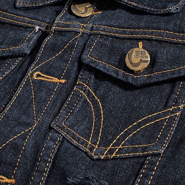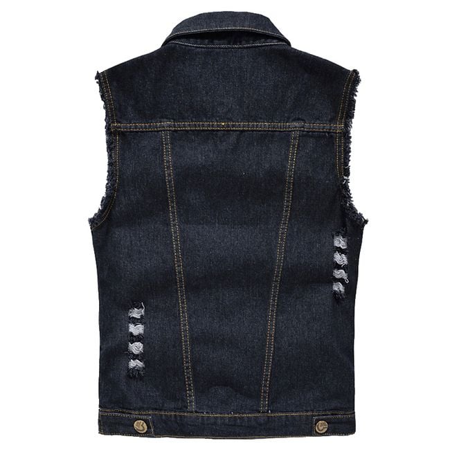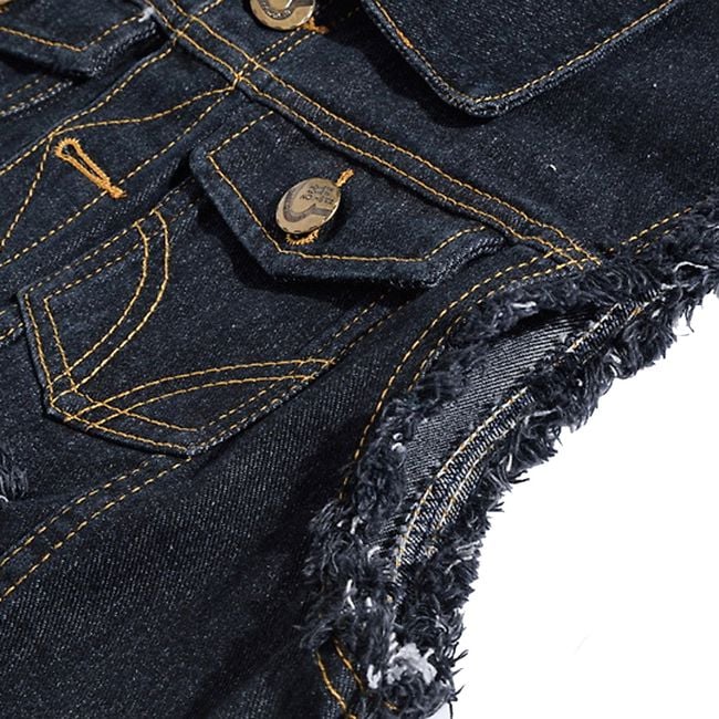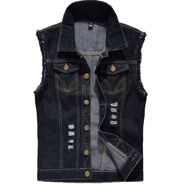 Men's dark denim waistcoat with gold buttons. The size chart shows the measurements of the product, not the body.