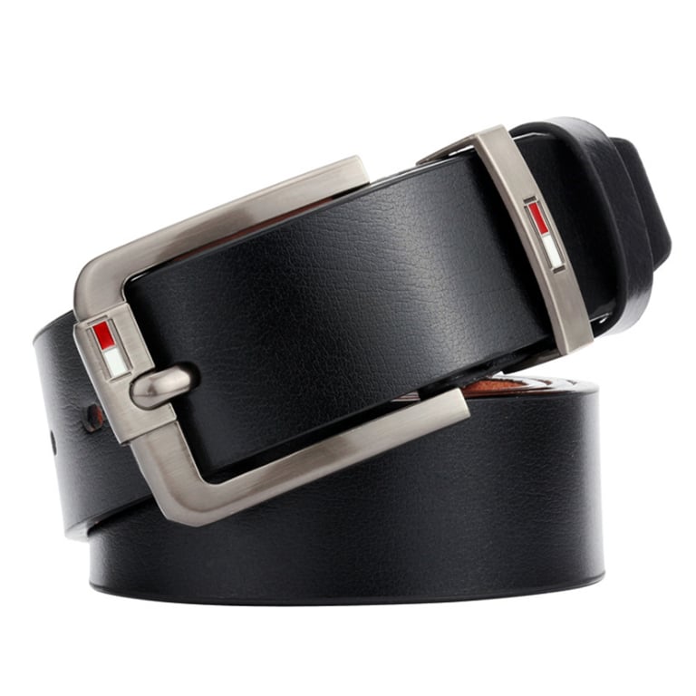Men's leather belt made from high-quality cowhide. The belt features a classic buckle with a logo. The buckle is made of steel. It is suitable for everyday wear as well as for formal occasions.