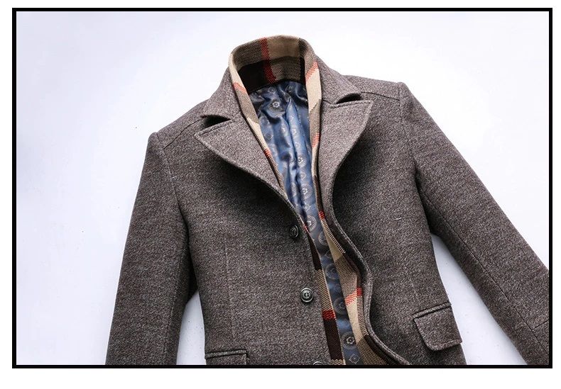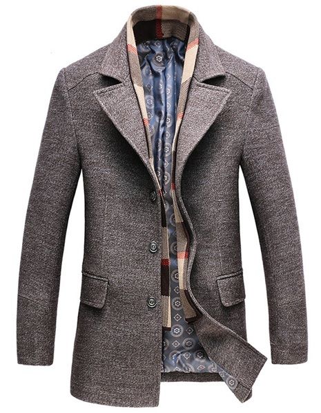 The coat features a checkered scarf attached with buttons, which you can detach as needed.
