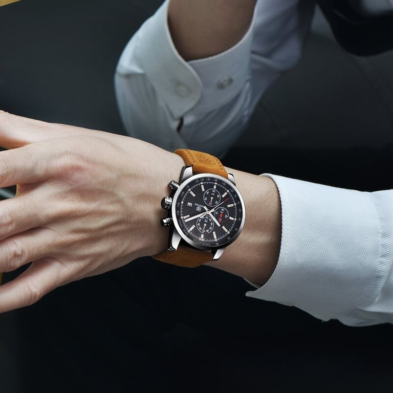 Modern men's watch with a leather strap that looks very elegant on the wrist. The watch features second and day indicators on the dial. A suitable fashion accessory for anything.