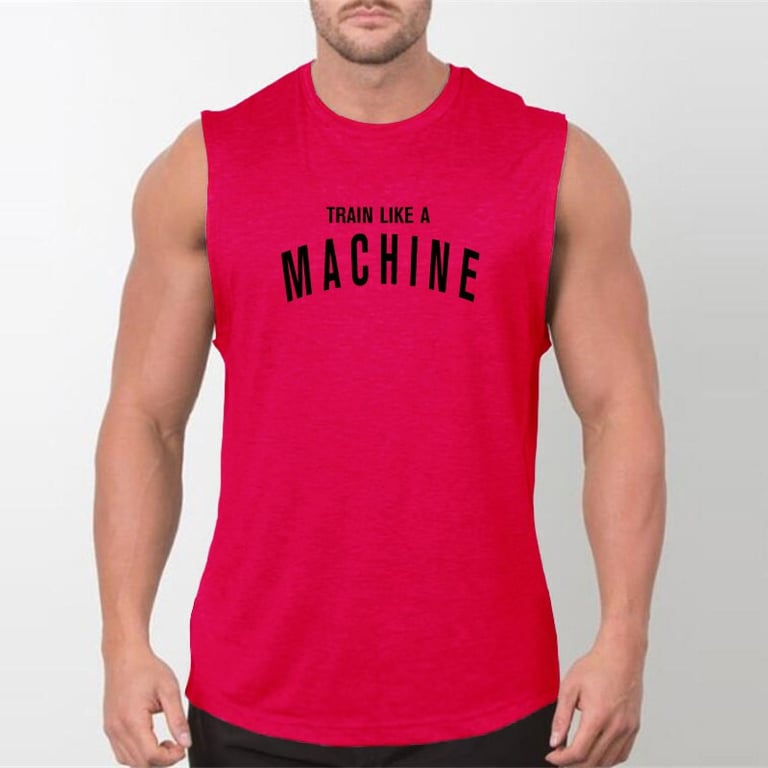 Men's sleeveless sports t-shirt with wide straps and a round neckline. Printed text on the front. Available in multiple colour options.