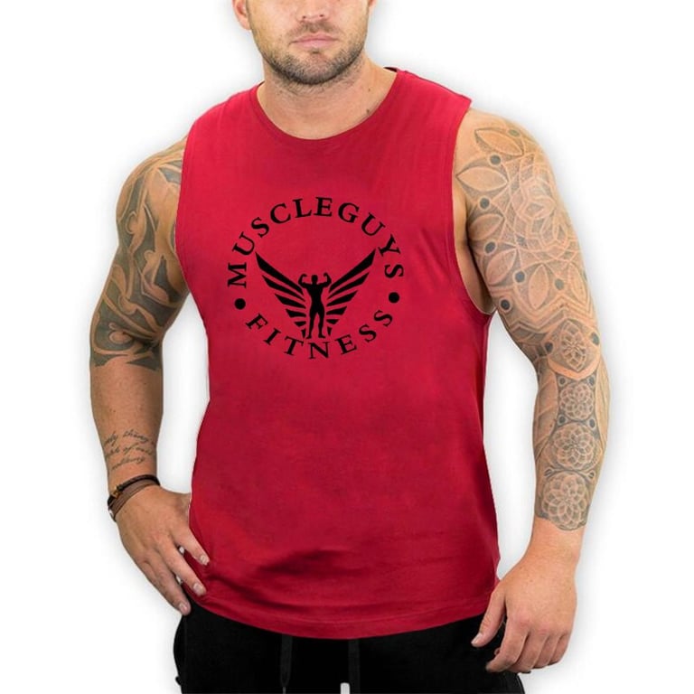 Men's sleeveless sports t-shirt with wide straps and a round neckline. Solid colour with black print on the front. Available in multiple colour options.