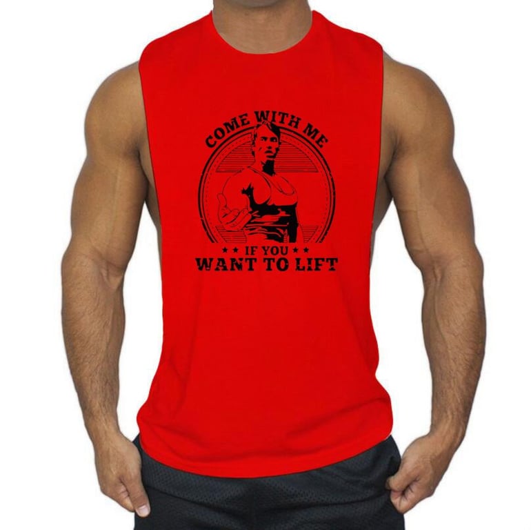 Men's sleeveless sports t-shirt with wide straps and a round neckline. Solid colour with a print and text on the front. Available in multiple colour options.